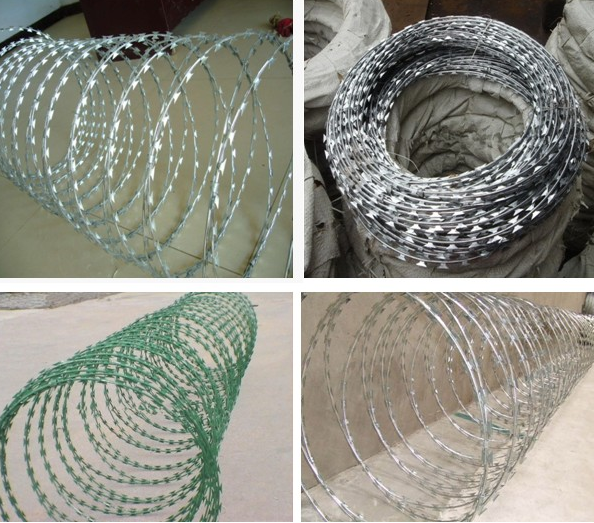 圍墻安全防護刀刺滾網特 點:圍墻安全防護刀刺滾網又名刮刀型刺絲,是一種近年發展起來的防護、隔離能力較強的新型防護網產品。它采用鋼板沖壓成型包附于鋼絲(筋絲)之上,由銳利尖角鍍鋅鋼板或不銹鋼薄板做刀片,高張力鋼絲做芯線組合而成的。鋒利的刀型刺由雙線扣裝后成蛇腹狀,既美觀又讓人不寒而栗。起到了很好的阻嚇作用。 用 途:世界各國已將刀片刺網廣泛用于軍事重地、監獄、政府機關、銀行;生活小區圍墻、私人住宅、別墅的圍墻、門窗、高速公路、鐵路護欄以及邊境線等防護保安。
