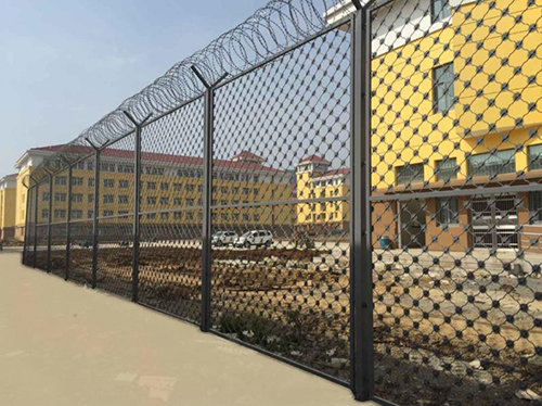 1.監獄隔離網的安裝結構:V型支架立拄,加強型焊接片網,安全防盜連接件和熱鍍鋅刀片刺籠組成。客戶要詳細說明這些組件的材質、規格,例如監獄隔離網的刀片刺網是采購不銹鋼304材質刀片刺網還是鍍鋅材質刀片刺網。V網是否折彎或者增加加強筋,有的客戶為了造價低廉也選擇不用V網,而是在Y形柱上焊接刺繩勾,直接把刀片刺繩掛在立柱上,用4根3mm左右鍍鋅絲加固。